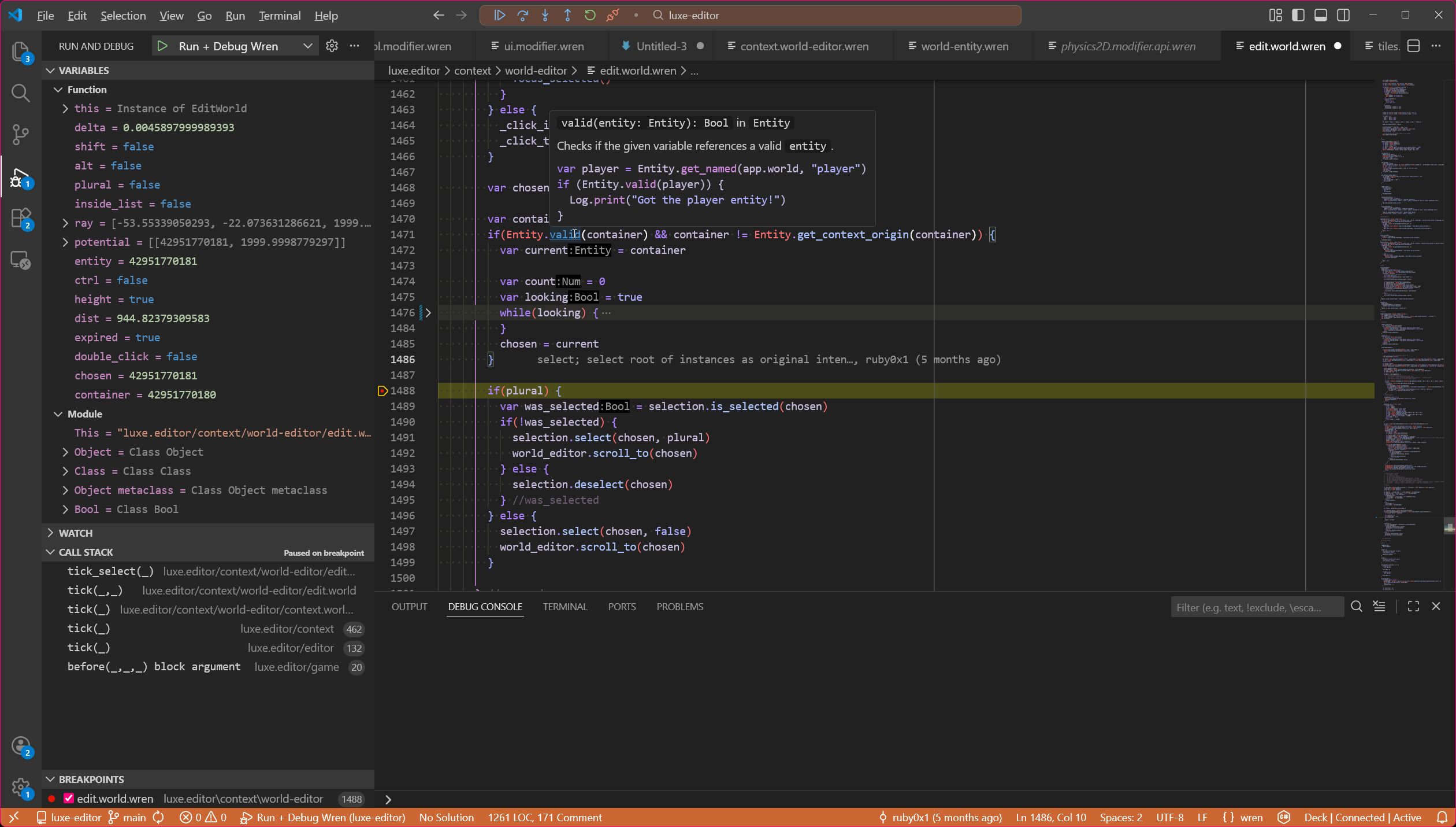 Above you can see it being used in the luxe editor, a very non-insignificant scale Wren project. The debugger includes variable inspection, sometimes editing, breakpoints, wait for debugger, attach, all the baseline things you might expect.