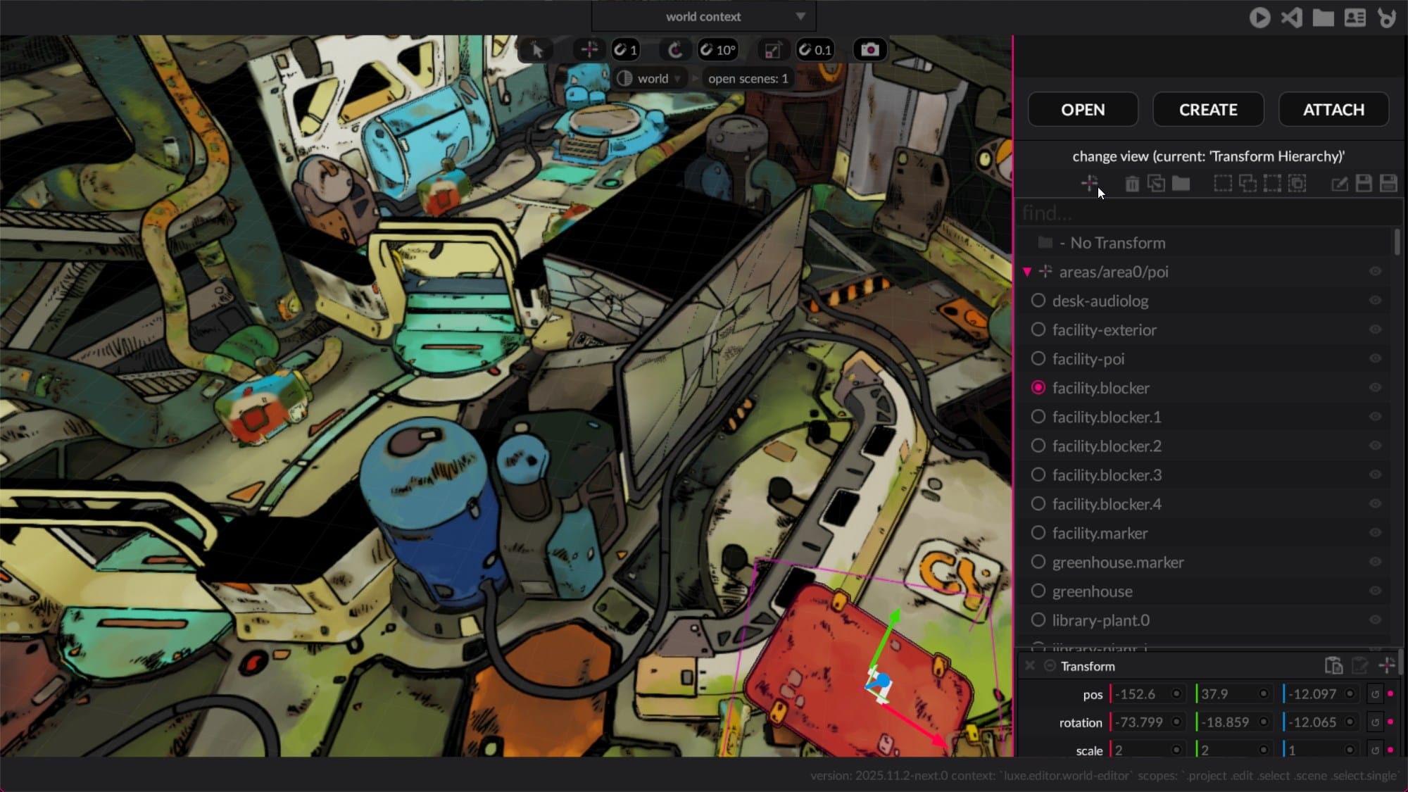 (ignore the alignment of nested things, we're polishing the UI)One of the big reasons is because not everything has or needs a transform, and more importantly because it typically isn't JUST transform being represented: it's active state, visible state, and transform all at once. Coupling these things together in our experience creates a lot of extra work, so we've never coupled them in the engine. That also means they were never coupled in the editor!